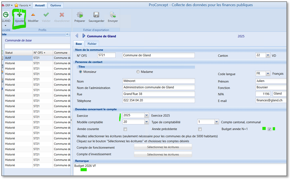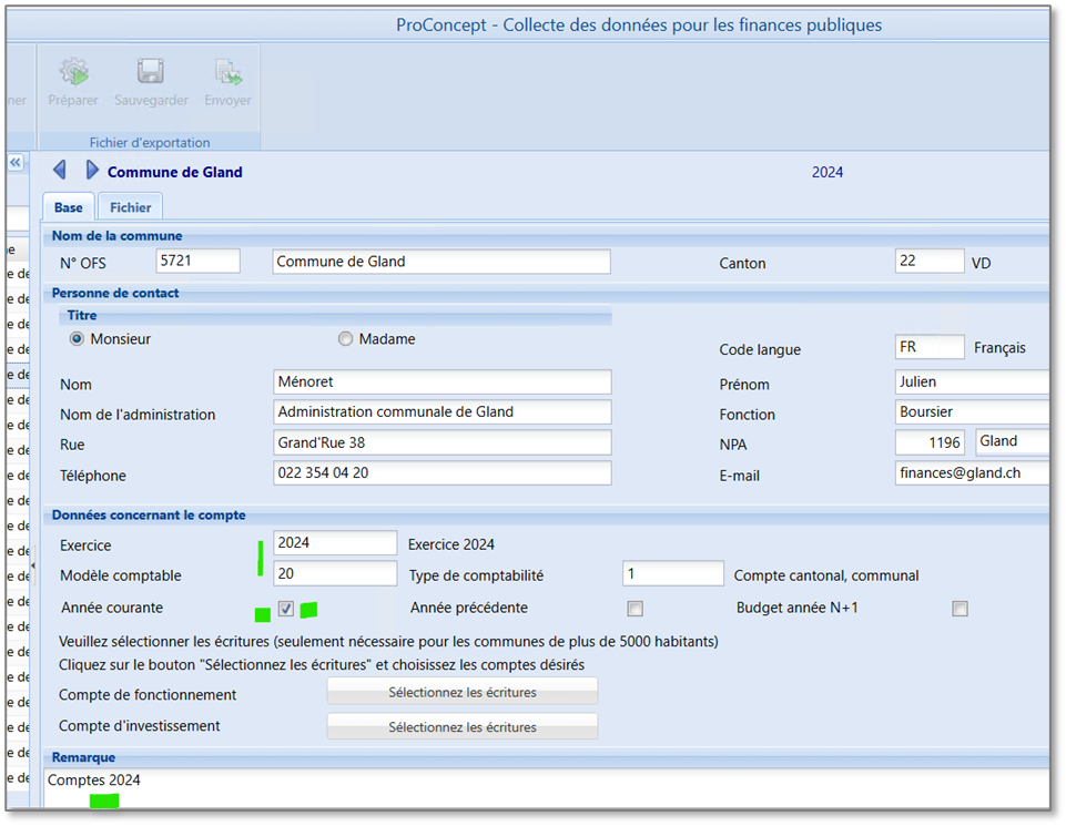 Procéder de la même manière que pour le contrôle de budget, mais avec des données saisies en vue de l’export des comptes :