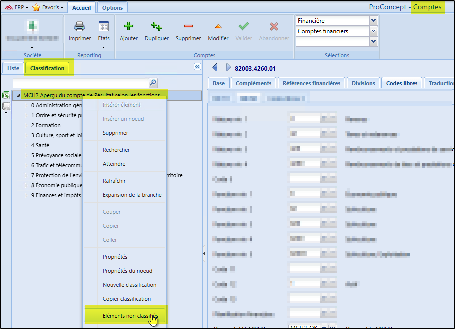 Dans l’objet “Comptes”, aller dans l’onglet “Classification”, choisir la classification concernée avec un clic droit dans le champ de recherche (ici “MCH2 Aperçu du compte de Résultat selon les fonctions”), puis faire un clic droit pour sélectionner “Eléments non classifiés”