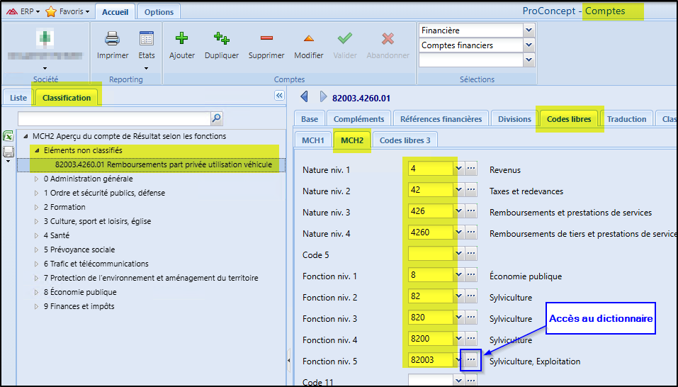 En se positionnant sur le compte, vérifier les codes libres 2 (pour MCH2) ou les codes libres 1 (pour MCH1 ou PCV).