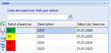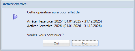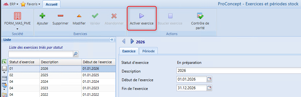 Dans l’exemple ci-après, il s’agit du passage de l’exercice 2025 à l’exercice 2026.