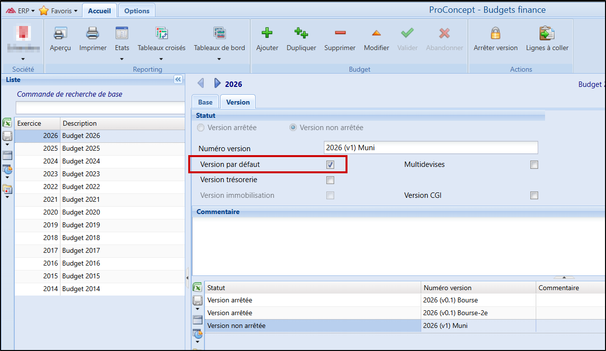 Important : Il faut obligatoirement une version de budget cochée “par défaut” dans l’objet “Budgets finance”: