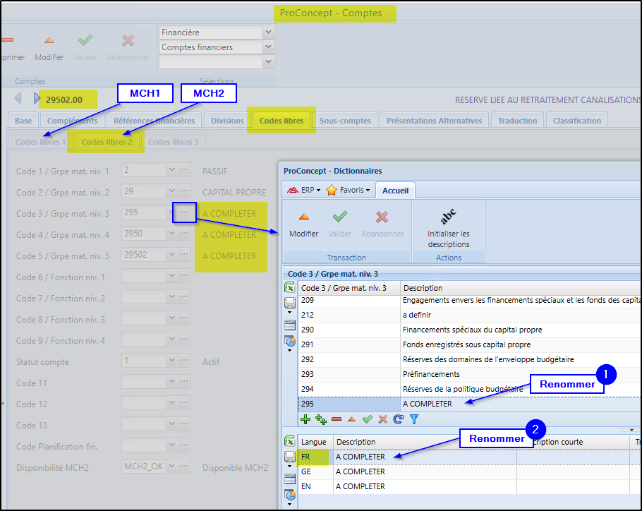 Si on reprend l’exemple ci-dessus, en recherchant la compte 29502.00 dans la gestion des comptes, onglets Codes libres > Codes libres 2 (car MCH2 dans ce cas), on retrouve effectivement le libellé “A COMPLETER” à côté des codes 295, 2950, 29502.