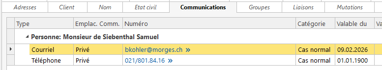 !!! ATTENTION !!! la nouvelle adresse email a le type “Privé” tout comme la 1re. innosolv envoie donc la nouvelle adresse ce qui écrase l’ancienne dans Abacus. Si celle-ci était utilisée pour autre chose, notamment les salaires, cette nouvelle adresse email sera utilisée par défaut.