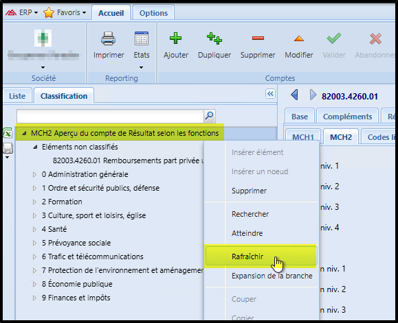 Dans l’objet “Comptes”, aller dans l’onglet “Classification”, choisir la classification concernée avec un clic droit dans le champ de recherche (ici “MCH2 Aperçu du compte de Résultat selon les fonctions”), puis faire un clic droit pour sélectionner “Eléments non classifiés”